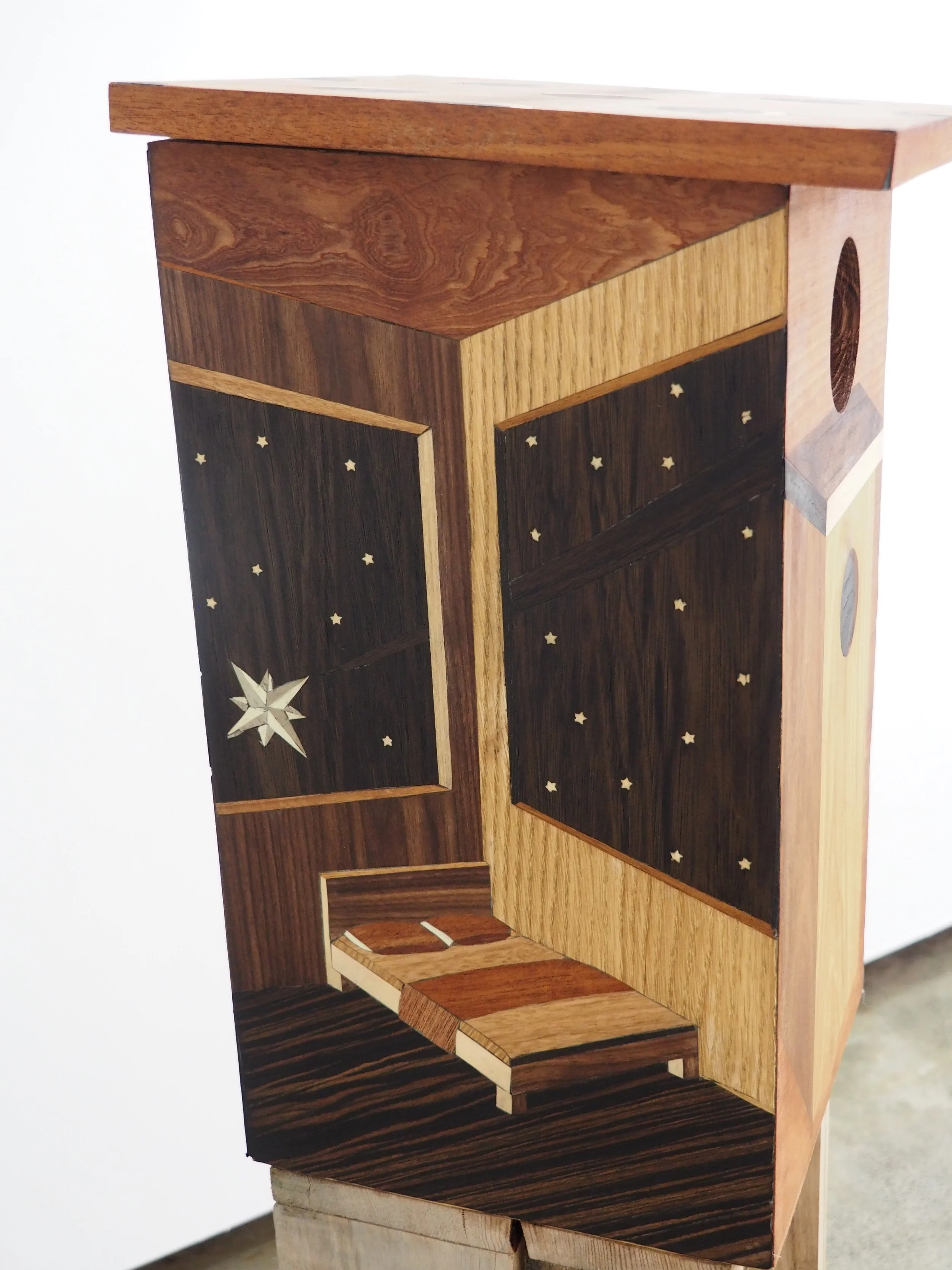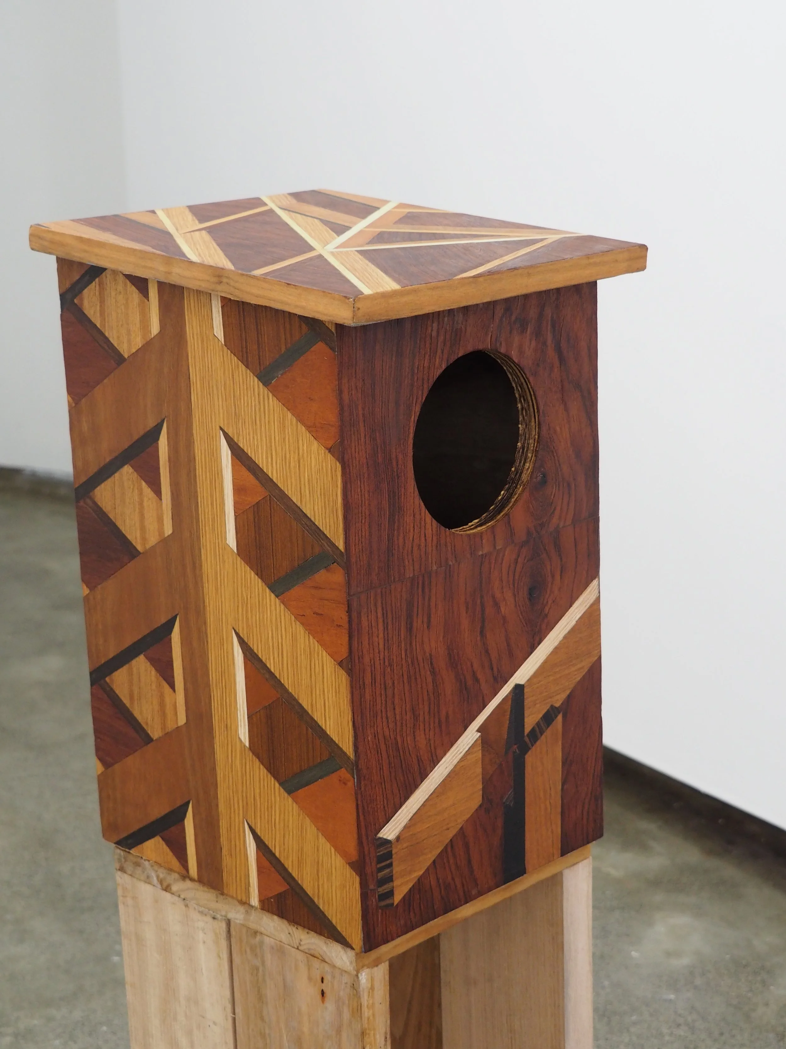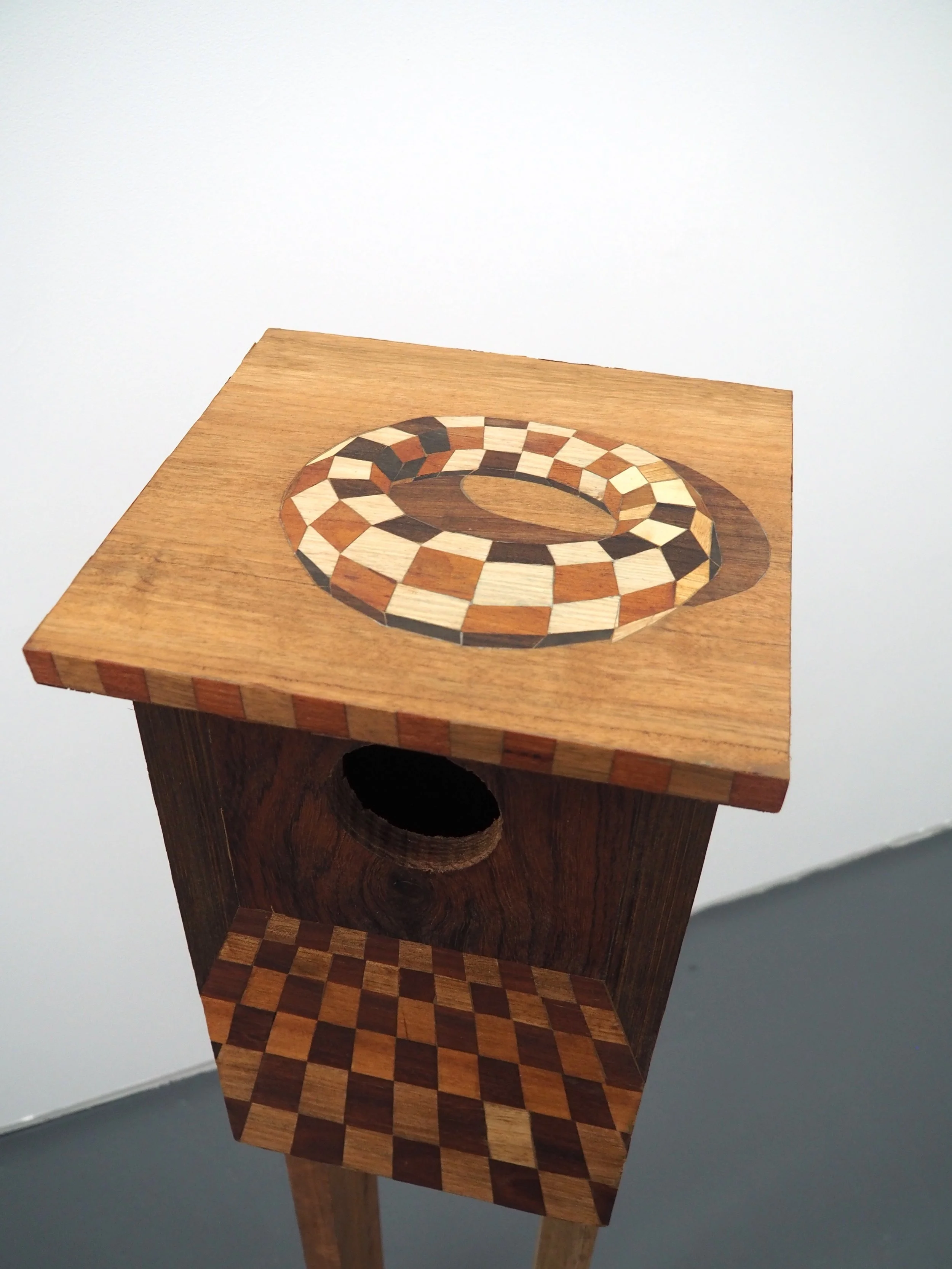'Hole,' 2025. Salvaged hardwood veneers with salvaged hardwood support (Marquetry.) 113 × 82 cm
