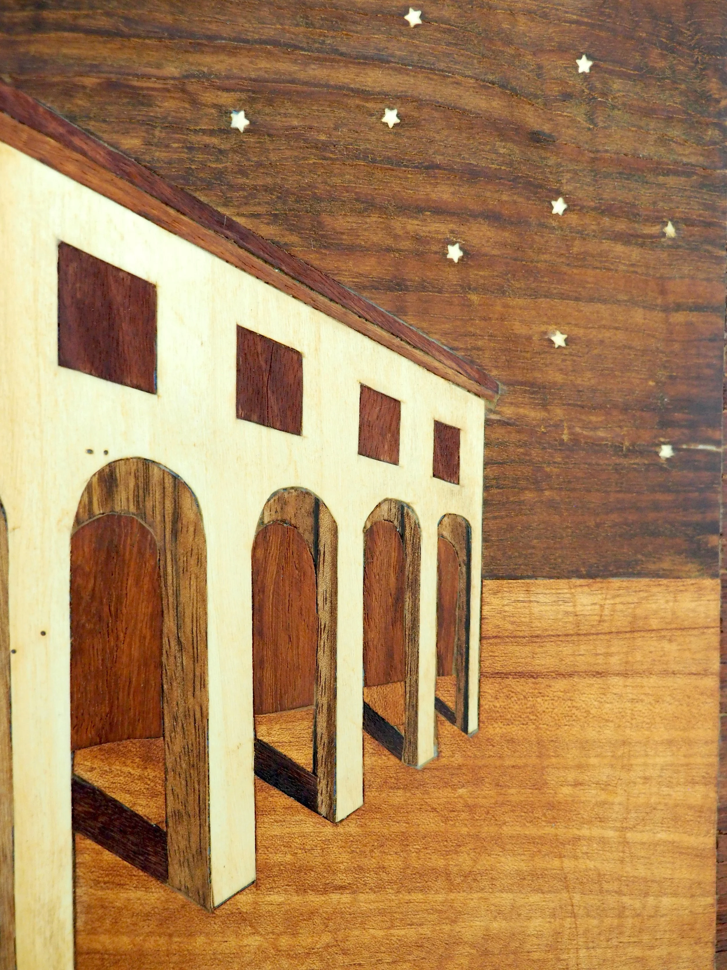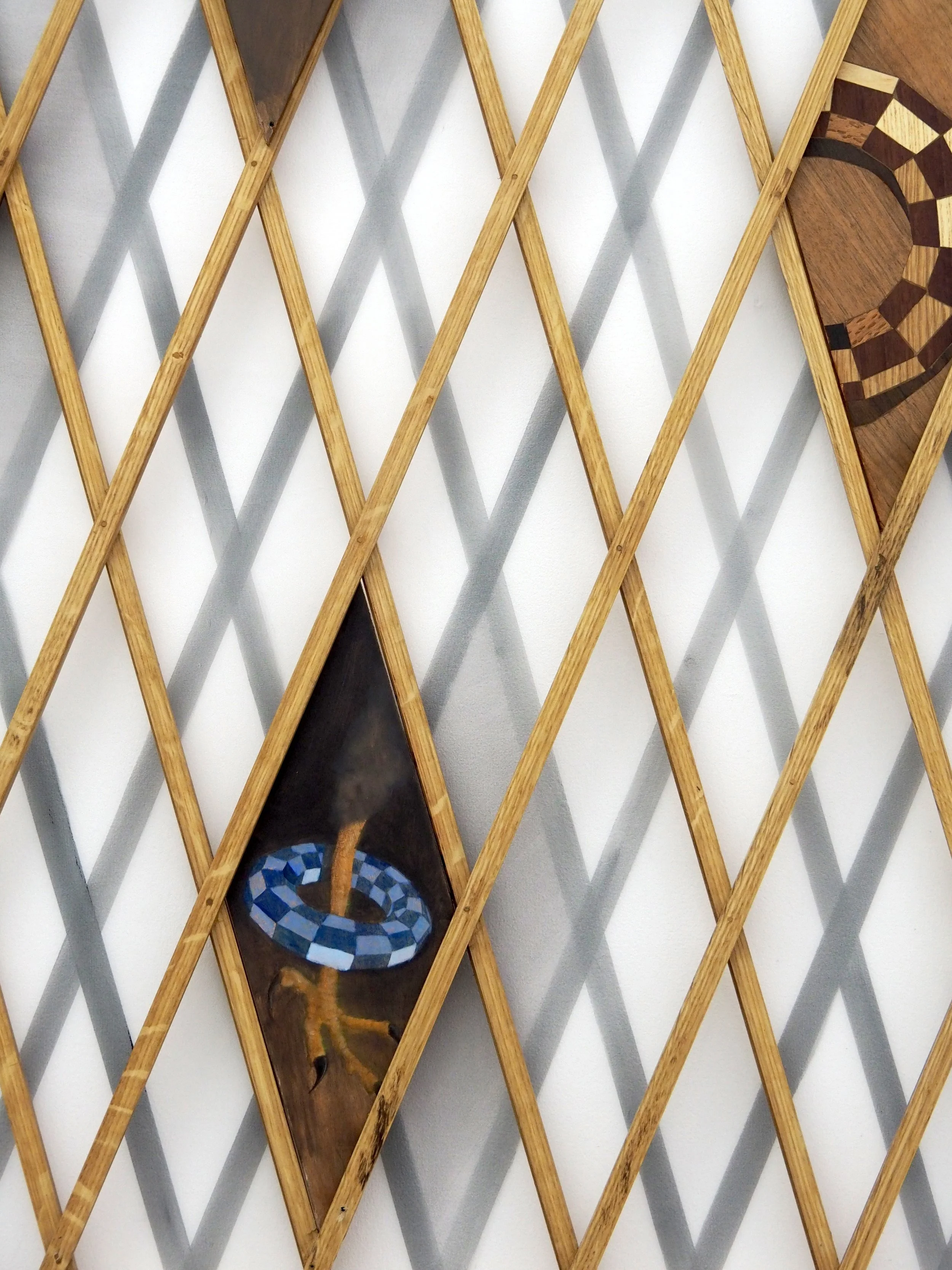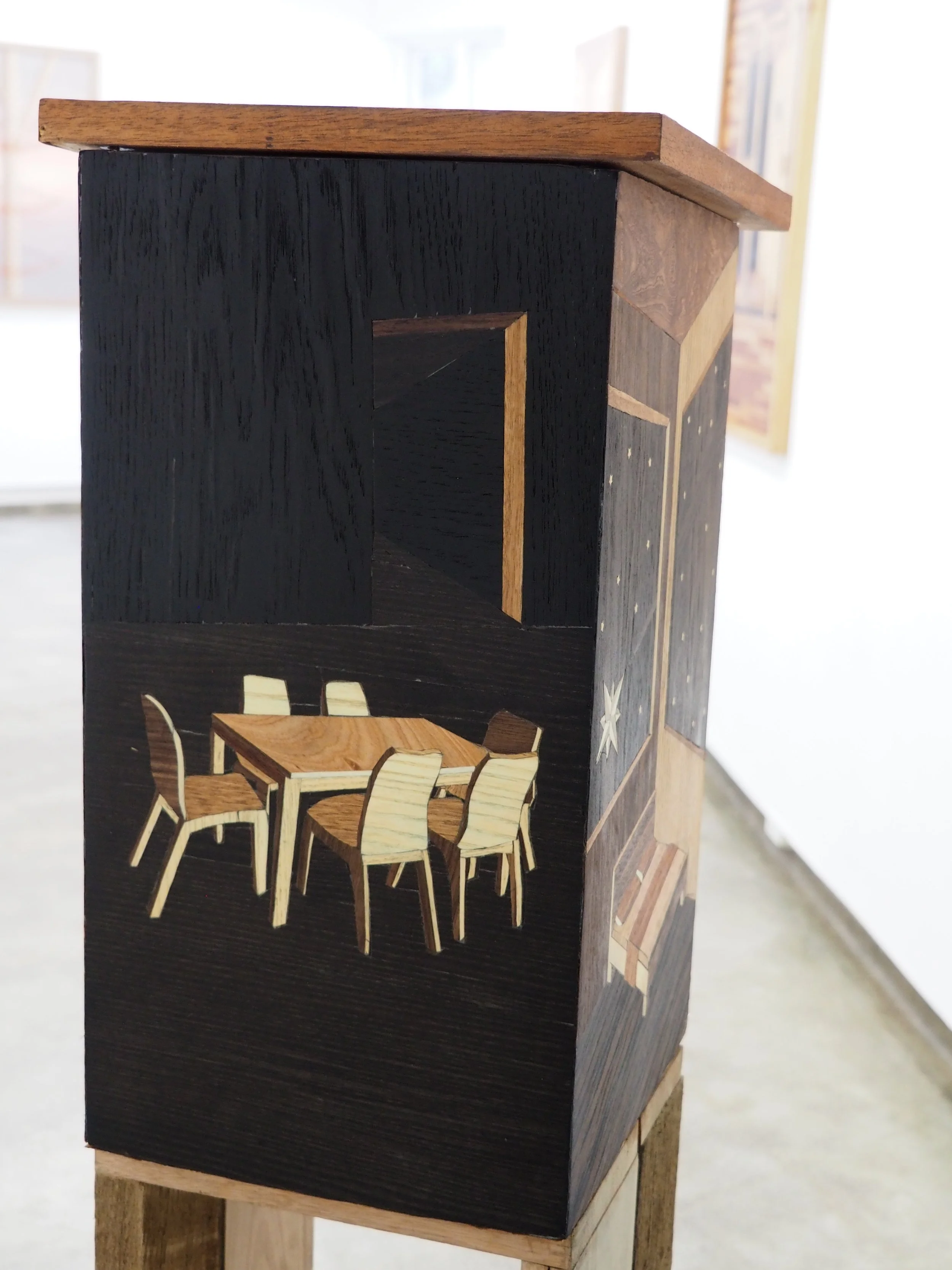 'Hole,' 2025. Salvaged hardwood veneers with salvaged hardwood support (Marquetry.) 113 × 82 cm