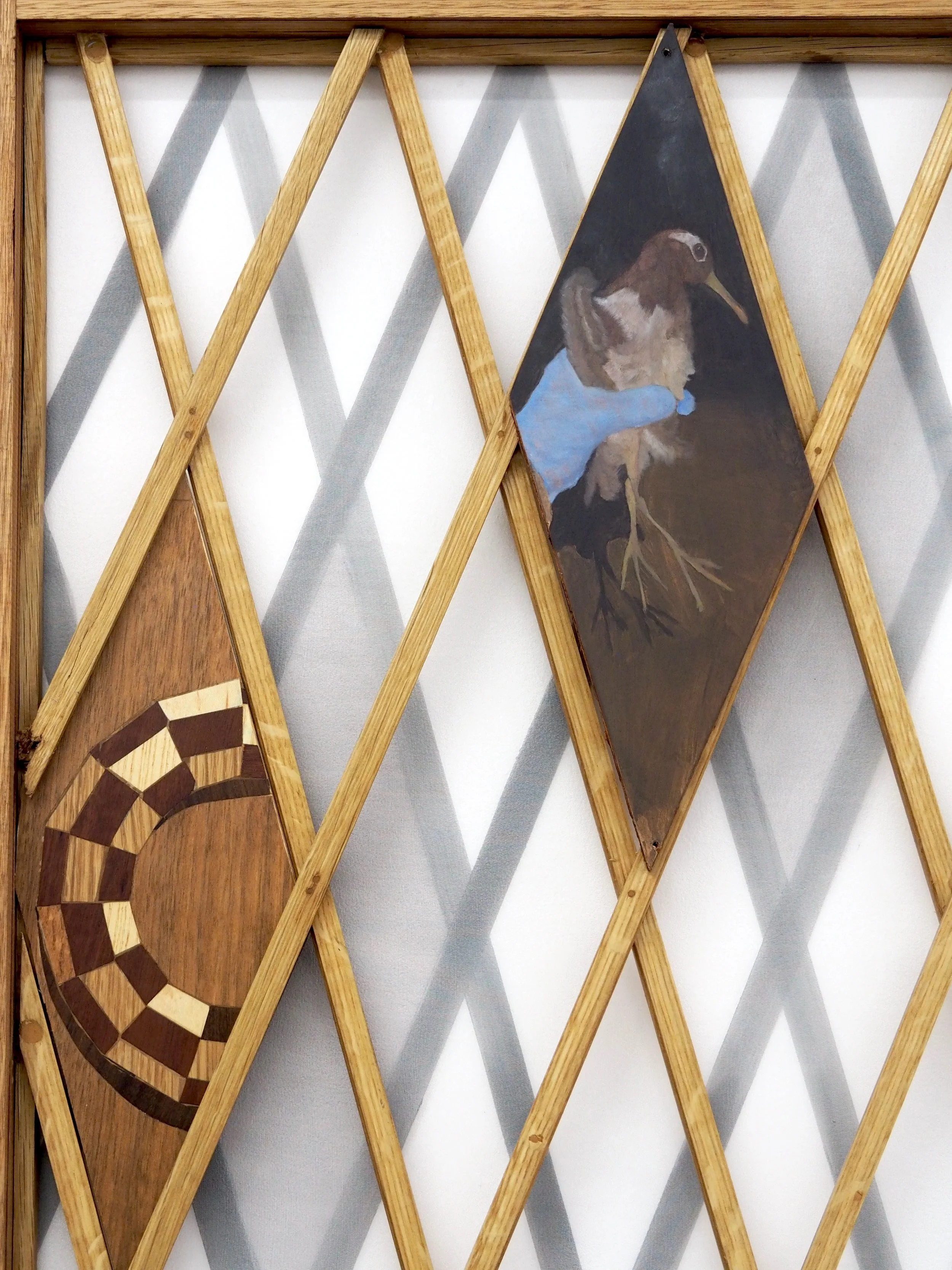 'Bird Hide,' 2025 Oil on organza with salvaged hardwood and timber inlay support 113 x 82 cm