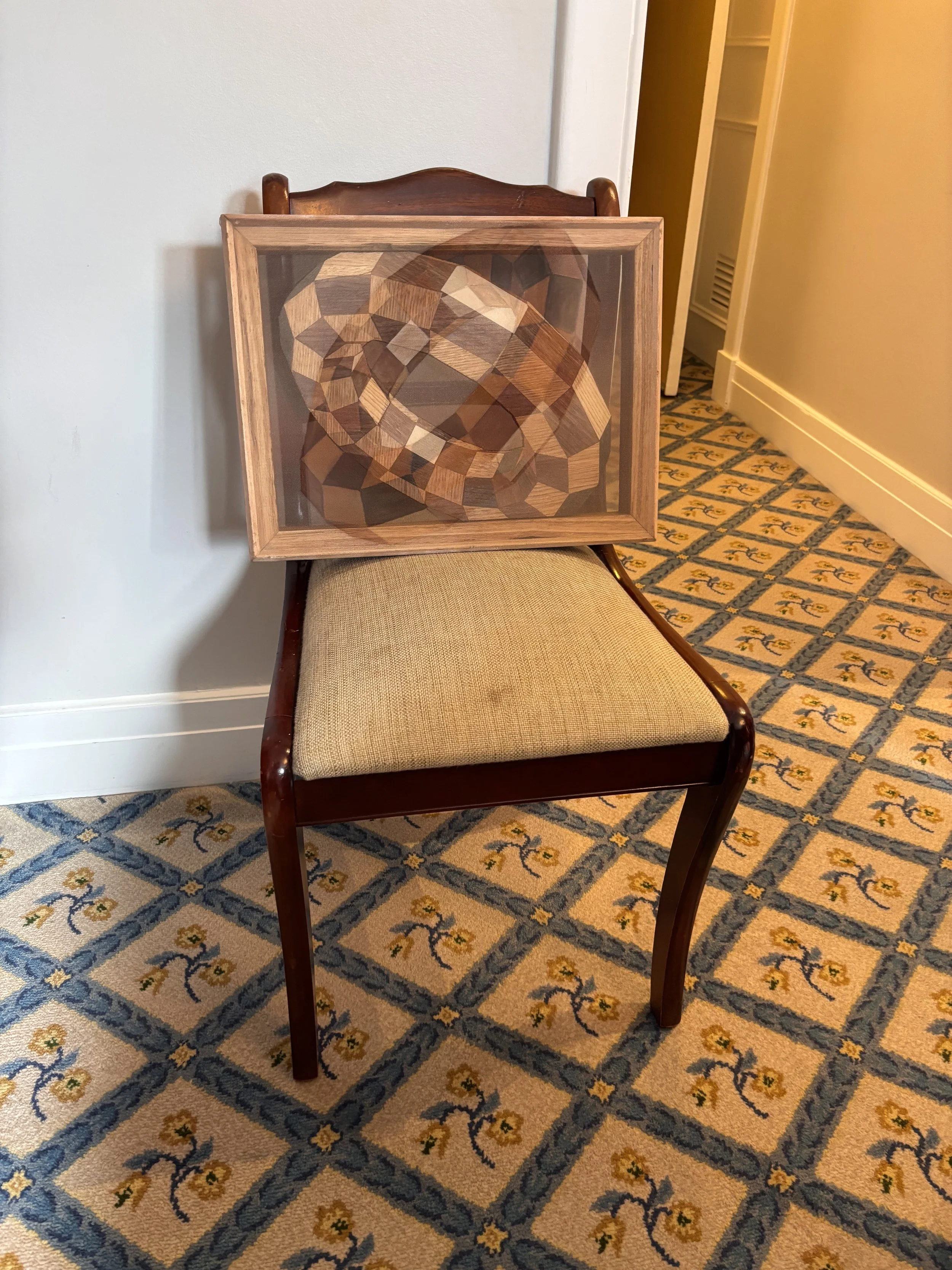 'Journey,' 2025, Oil on organza, timber inlay, ash and ironbark support. 33 x 44.5cm